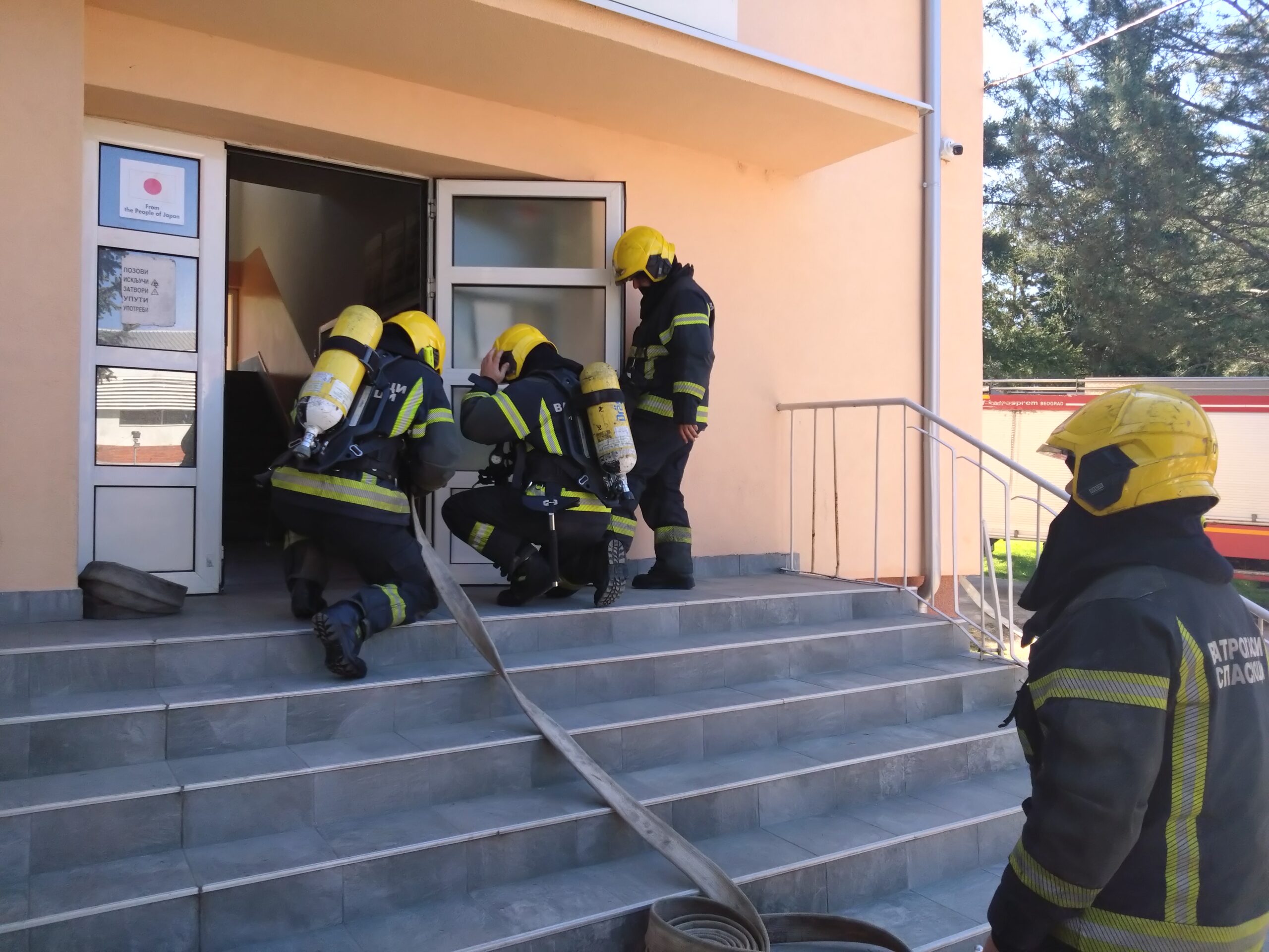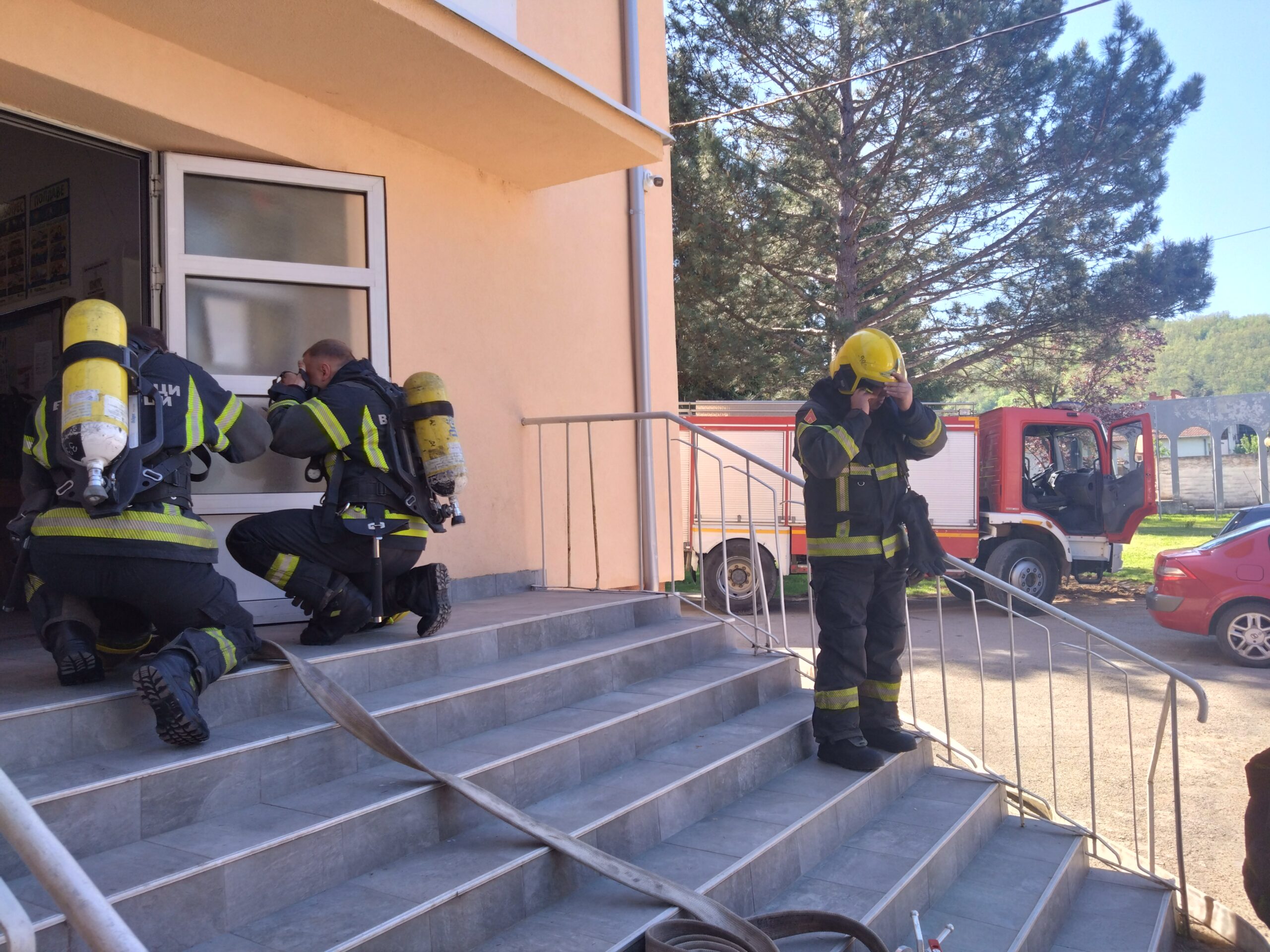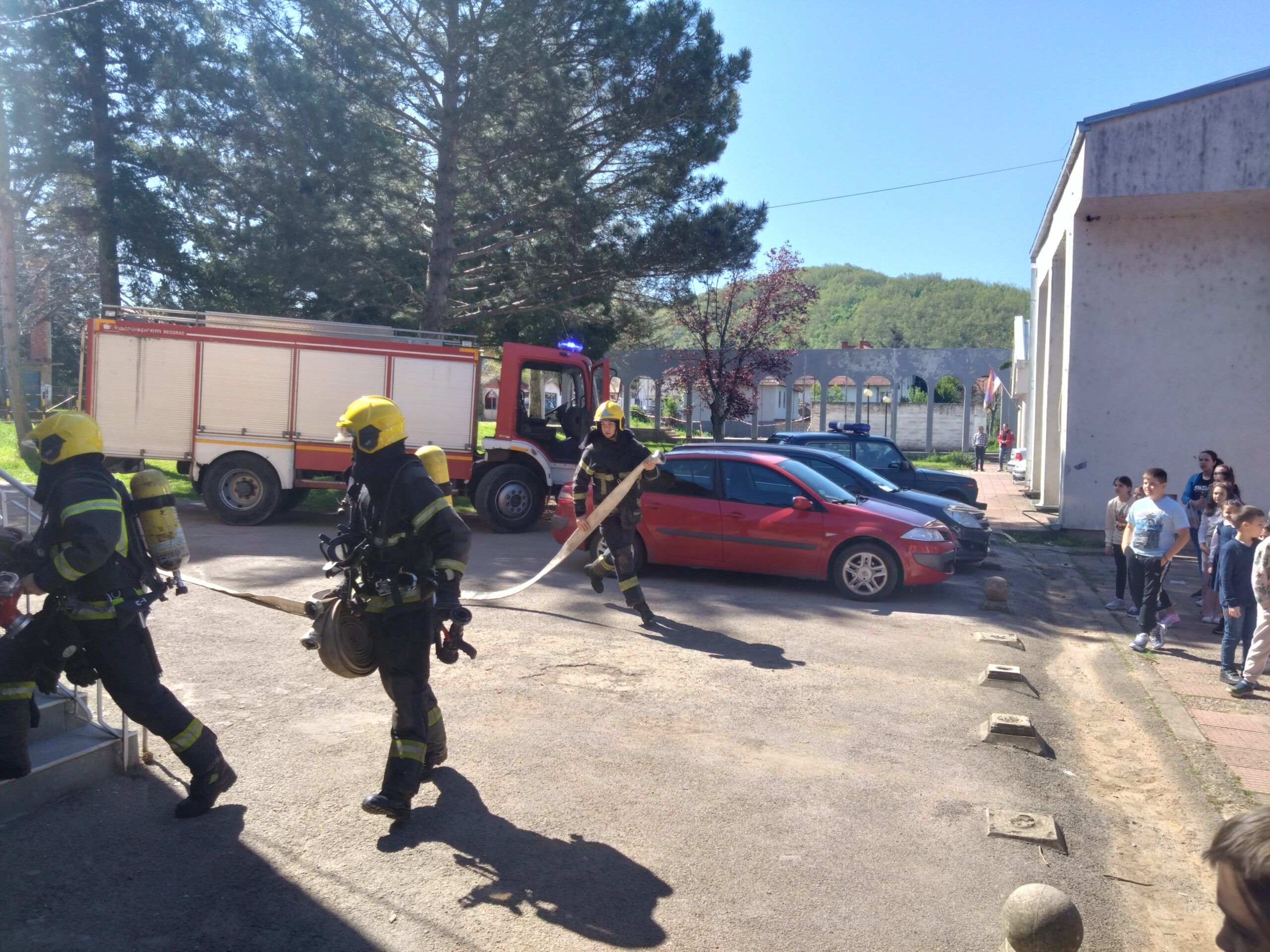 Увежбани чланови ватрогасно-спасилачке јединице из Гаџиног Хана верно су симулирали, нашим ученицима, гашење пожара у објекту. Након тога су деца имала прилику да се упознају са делом опреме коју свакодневно користе ватрогасци-спасиоци и чују њихова искуства у обављању овог опасног, али хуманог посла. Хвала ватрогасцима на приказаној вежби и издвојеном времену.